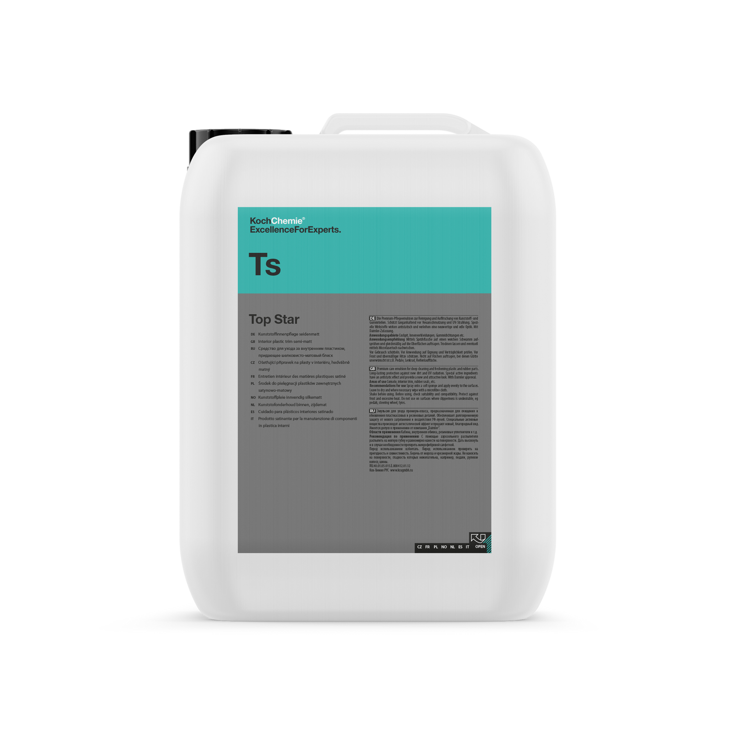 Premium care emulsion for deep pore cleaning and freshening plastic and rubber parts such as consoles, interior trim, seals, etc. Top Star creates a long-lasting, semigloss, natural sheen and protects the surface permanently against new dirt and UV radiation. Special active ingredients keep plastic supple, have an antistatic effect and provide a new and attractive look. With fresh fragrance. With Daimler approval.
