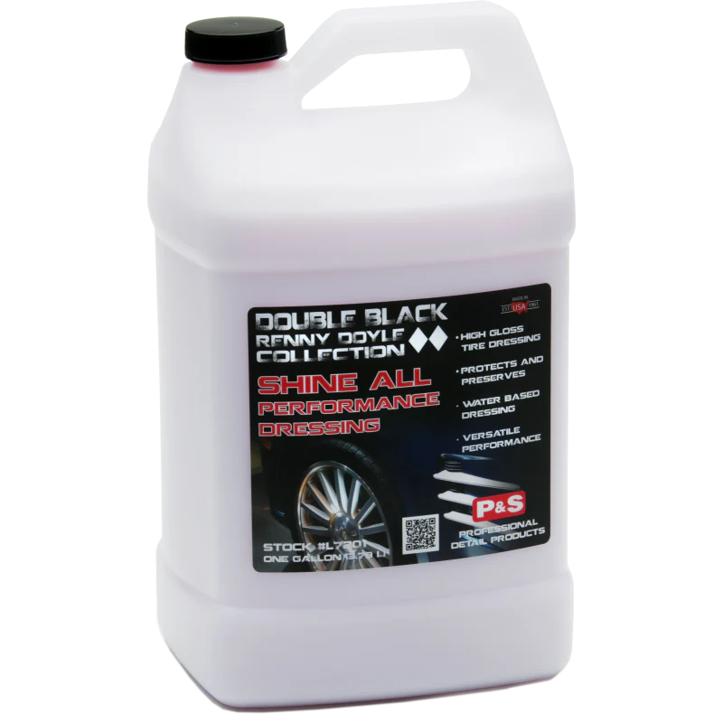 Shine All truly outperforms competitive water based tire dressings. This exceptional product was built specifically for use as a high performance tire dressing. Perfect for use in car washes, detail shops, rental fleets, etc. Although formulated for exterior use; Shine All may also be used as an interior dressing to condition, soften, preserve and protect all leather, rubber, vinyl and leather surfaces. Shine All produces a glossy finish.